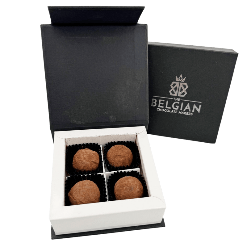 Enjoy our box of 4 Belgian chocolate truffles with rich cacao flavour, handmade in Brussels from ethical beans. A refined gift or gourmet indulgence.