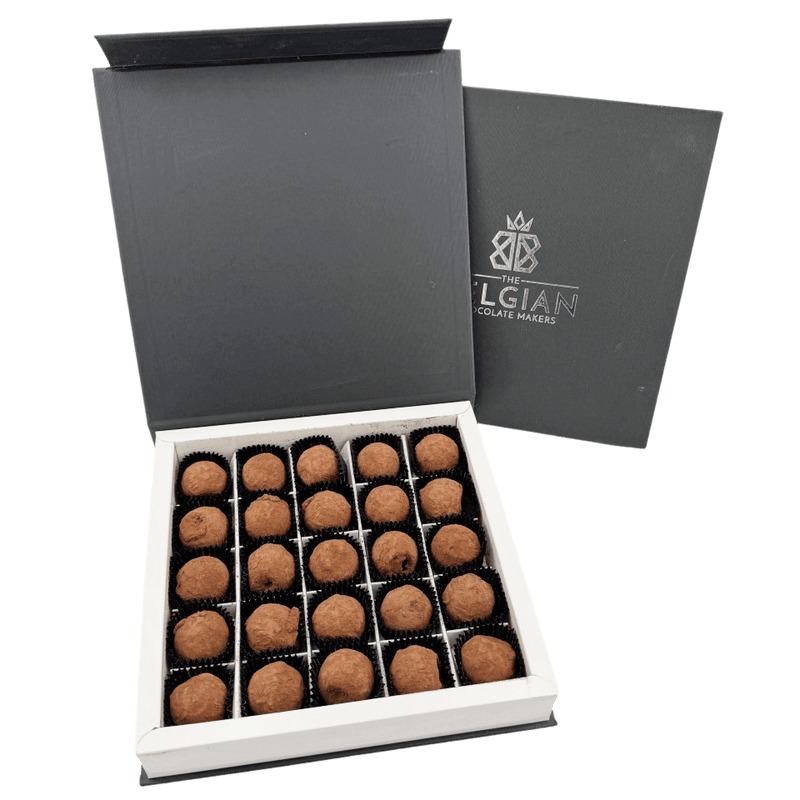 Enjoy our box of 25 Belgian chocolate truffles with rich cacao flavour, handmade in Brussels from ethical beans. A refined gift or gourmet indulgence.