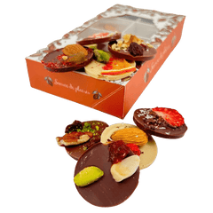 Enjoy our box of 24 Belgian chocolate mendiants, handcrafted in Brussels with ethical cacao and gourmet toppings. A refined gift or indulgent treat.
