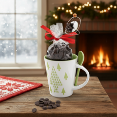 Dark chocolate drops in a Christmas tree mug 200g, a rich Belgian treat presented in a charming festive tree mug. Perfect for gifting, cosy winter moments, or adding sweetness to the holiday season.