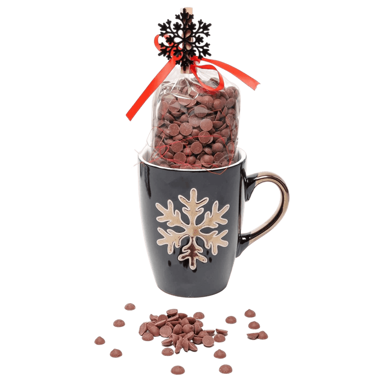 Dark chocolate drops in a snowflake mug 200g, a cosy Belgian winter treat featuring intense dark chocolate drops in a charming snowflake mug. Perfect for gifting, sharing, or enjoying on chilly days.