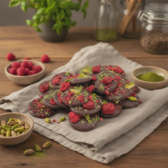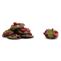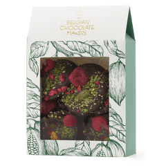 Delicious 150g dark chocolate mendiants topped with raspberry and pistachio chunks, a perfect blend of rich cocoa and crunchy goodness.