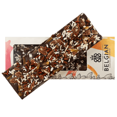 Enjoy our Fantasy dark chocolate bar 550g, enriched with pecan nuts, goji berries, lemon and almond chunks. A gourmet oversized Belgian treat, perfect for sharing or gifting.