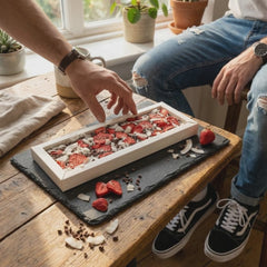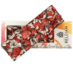 Indulge in our Fantasy milk chocolate bar 550g, enriched with crunchy cacao nibs, strawberry and coconut chunks. A gourmet oversized Belgian treat, perfect for sharing or gifting.