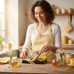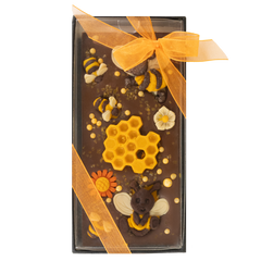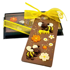 Savour our 110g milk chocolate bee bar, handcrafted in Belgium with smooth, creamy cocoa, a delightful creation celebrating nature, sweetness, and artisan craftsmanship.