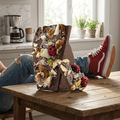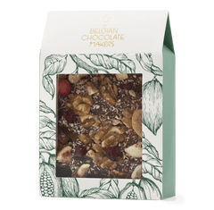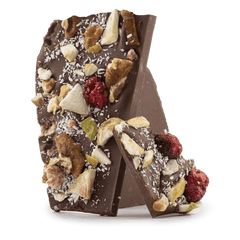 Handcrafted milk chocolate broken bars with fig, lemon, cranberry, walnut, coconut. Made with fine cocoa from Haiti, delivering a smooth, fruity, and nutty gourmet delight.