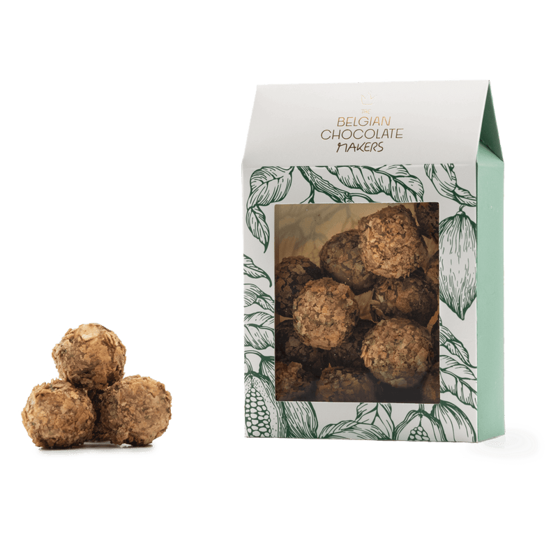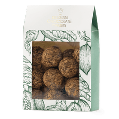 Savor our 160g pouch of Belgian chocolate truffles with feuilletine. Handcrafted in Brussels, combining smooth cacao with crisp caramelized flakes for a truly indulgent crunch.