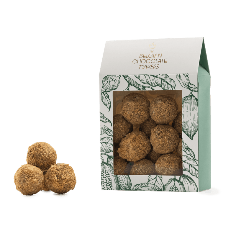 Indulge in our 160g pouch of Belgian chocolate truffles with speculoos. Handcrafted in Brussels, combining rich cacao with spiced biscuit flavors for a gourmet delight.