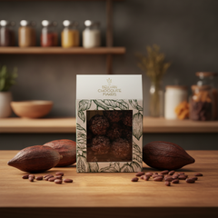 Discover our 160g pouch of Belgian chocolate truffles with cacao nibs. Handcrafted in Brussels, combining smooth cacao with crunchy nibs for an intense gourmet experience.