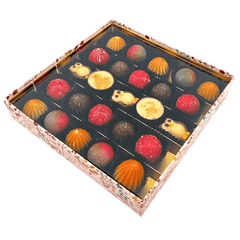 Ingredients: Sugar, cocoa butter, cocoa mass, milk powder, hazelnut, almond, cream, pomegranate purée, glucose syrup, sorbitol, butter, coffee, fruit juice and pulp (blueberry, blackcurrant, redcurrant), panela, pumpkin spice (cinnamon, nutmeg, cloves, ginger, chili, cardamom), mandarin, sunflower lecithin, Bourbon vanilla from Madagascar.