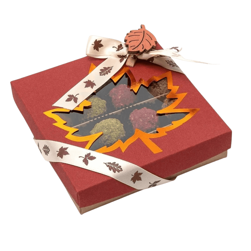 Mix di tartufi belgi autunnali in una confezione regalo rossa