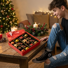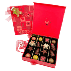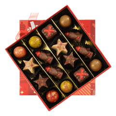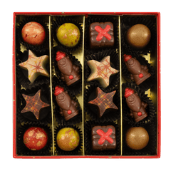 Condividete la gioia del Natale con la nostra scatola di cioccolato Ho-Ho-Ho, riempita con 16 praline belghe artigianali (240 g). Un assortimento festoso realizzato con cacao etico e passione artigianale a Bruxelles.