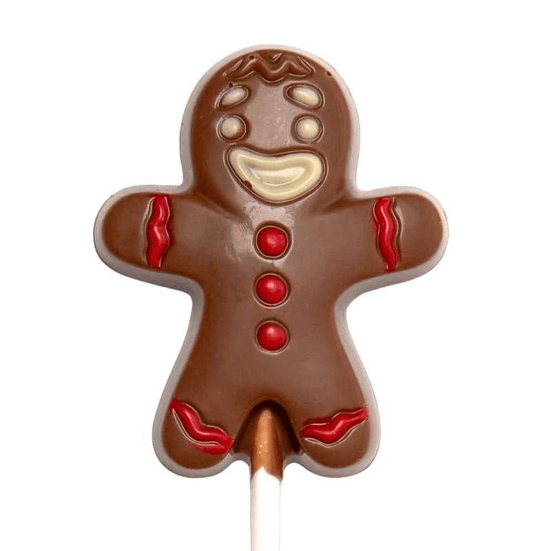 Ecco a voi il Signor Zenzero! Un delizioso lecca-lecca al cioccolato al latte fatto a mano a Bruxelles con cioccolato belga di prima qualità, il perfetto dolcetto festivo per i sorrisi invernali