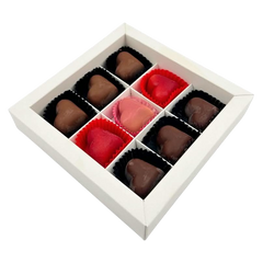 Innamoratevi della nostra confezione d'amore di 9 praline belghe (135 g), un'elegante selezione di cioccolatini fatti a mano e lavorati da bar a Bruxelles. Il regalo romantico perfetto che unisce passione, sapore e cacao etico.