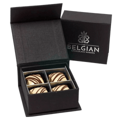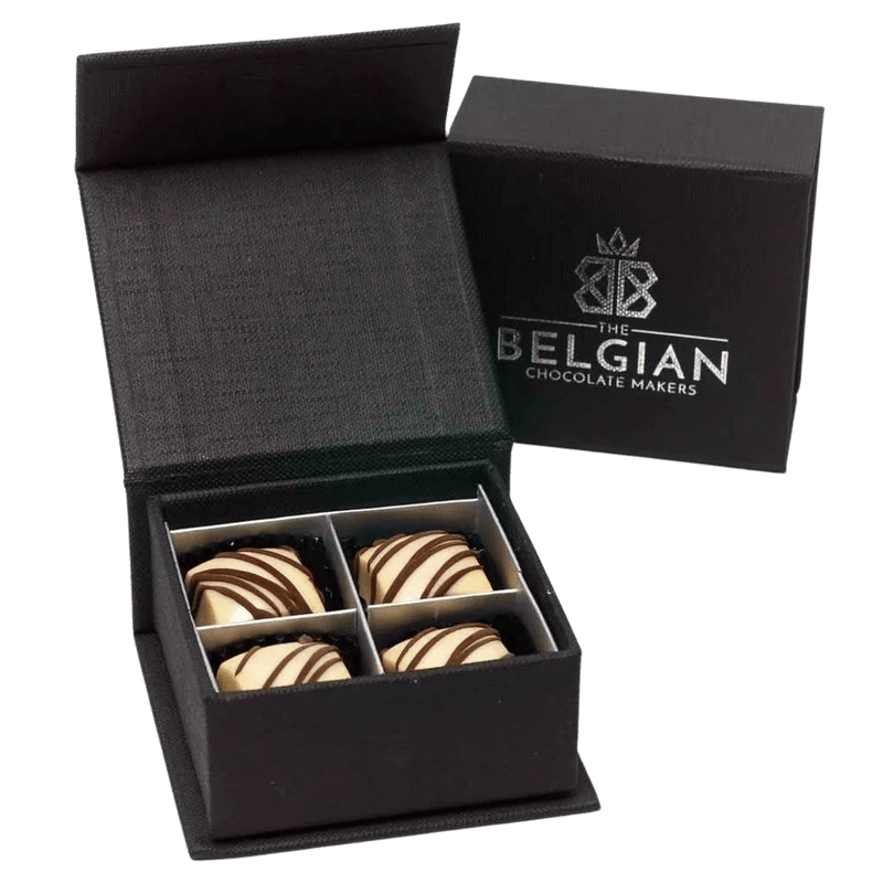 Concedetevi una lussuosa confezione di 4 praline di cioccolato belga al gusto di caramello, prodotte a Bruxelles con cacao etico. Un regalo raffinato o una delizia per i buongustai.