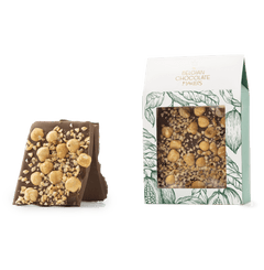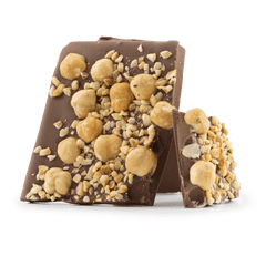 Tavolette spezzate di cioccolato al latte con nocciole, prodotte artigianalmente. Prodotte con cacao pregiato proveniente da Haiti, offrono una delizia da intenditori morbida, fruttata e con nocciole