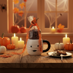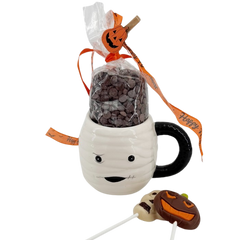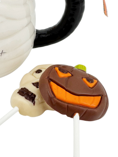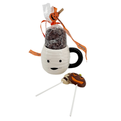 Spaventoso e delizioso! La nostra tazza a tema mummia è riempita con cremose gocce di cioccolato al latte belga e divertenti lecca-lecca. Un regalo di Halloween perfetto per i bambini e gli amanti del cioccolato