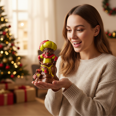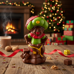 Scoprite Père Fouettard (compagno di San Nicola) in una figura artigianale di cioccolato al latte belga (230g). Prodotta a Bruxelles con cacao etico e tracciabile, è un omaggio giocoso alla tradizione natalizia belga e al folclore di San Nicola.