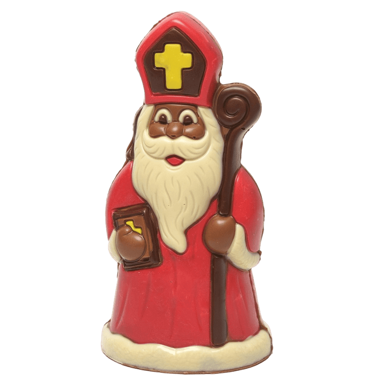 Scoprite il nostro San Nicola al latte con scettro da 225 g, prodotto artigianalmente in Belgio con cacao ricco e morbido, un capolavoro festivo che simboleggia la tradizione e la pura indulgenza.