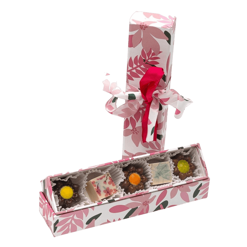 Godetevi la nostra confezione primaverile di 5 praline belghe artigianali (75 g). Prodotto a Bruxelles con cacao premium e tracciabile, questo elegante mini-assortimento è il regalo stagionale perfetto per celebrare i sapori e i colori della primavera
