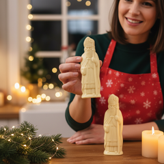 Godetevi le nostre caracche di San Nicola (2×35 g) in cioccolato bianco, realizzate a mano in Belgio con cioccolato fine, eleganti dischi festivi che combinano qualità artigianale, gusto ricco e tradizione festiva.