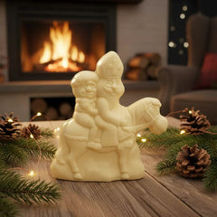 Concedetevi il nostro San Nicola di cioccolato bianco da 230 g in sella al suo cavallo, realizzato a mano in Belgio con burro di cacao cremoso e di prima qualità, una deliziosa statuetta festiva che celebra la tradizione natalizia.